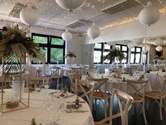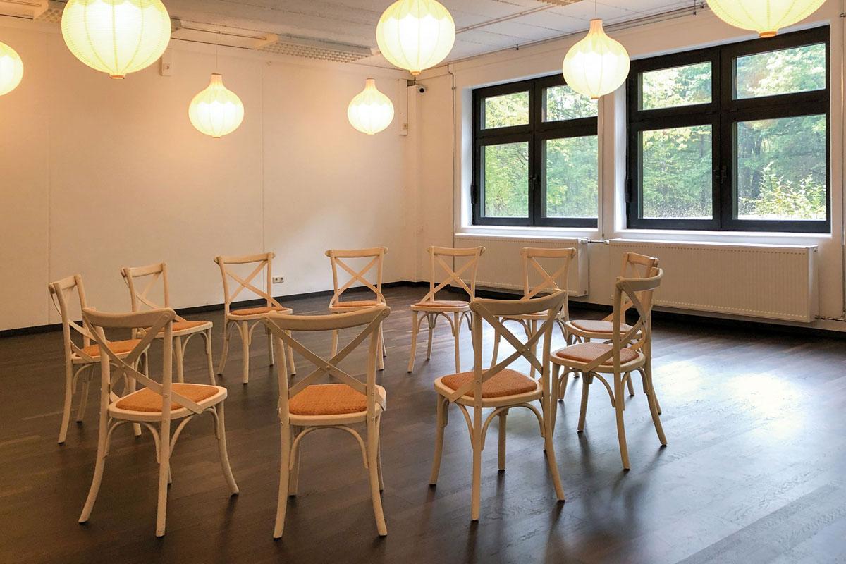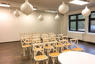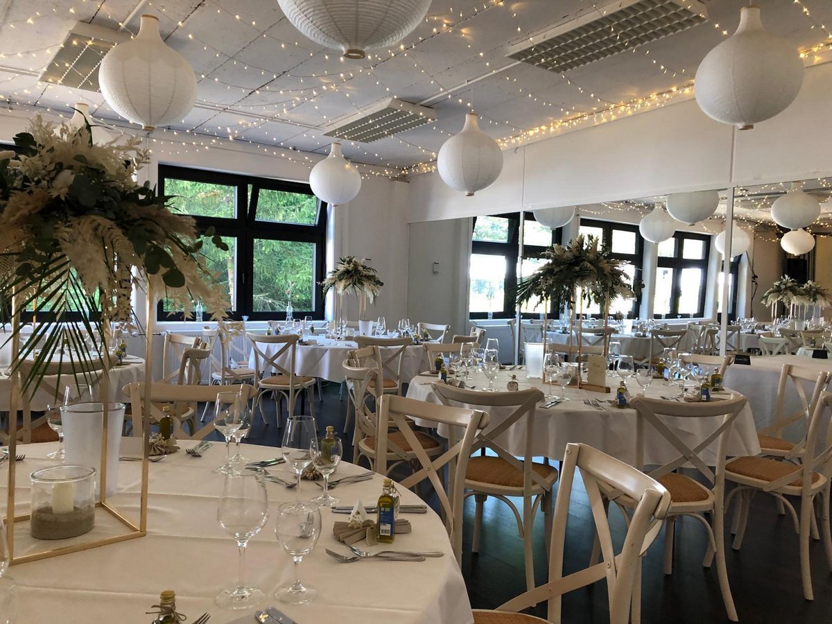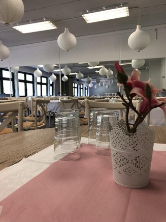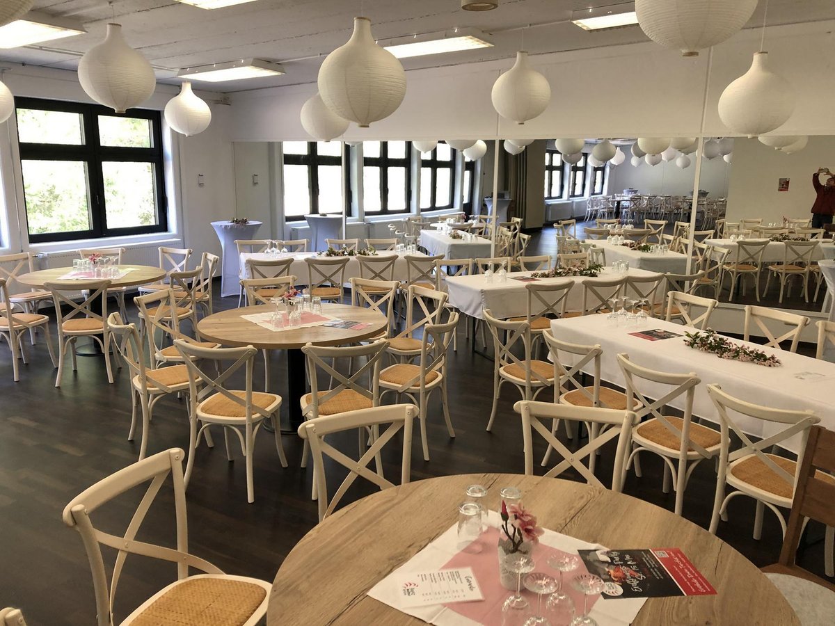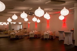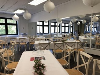 Der großzügige Saal mit seinen weiten Fensterfronten ist ein echter Verwandlungskünstler. Er macht sich bei einem Business-Vortrag mit Stuhlreihen und Stehtischen ebenso gut, wie mit prächtig geschmückten runden Tischen, weißen Hussen und opulentem Blumenschmuck bei einer Familienfeier.